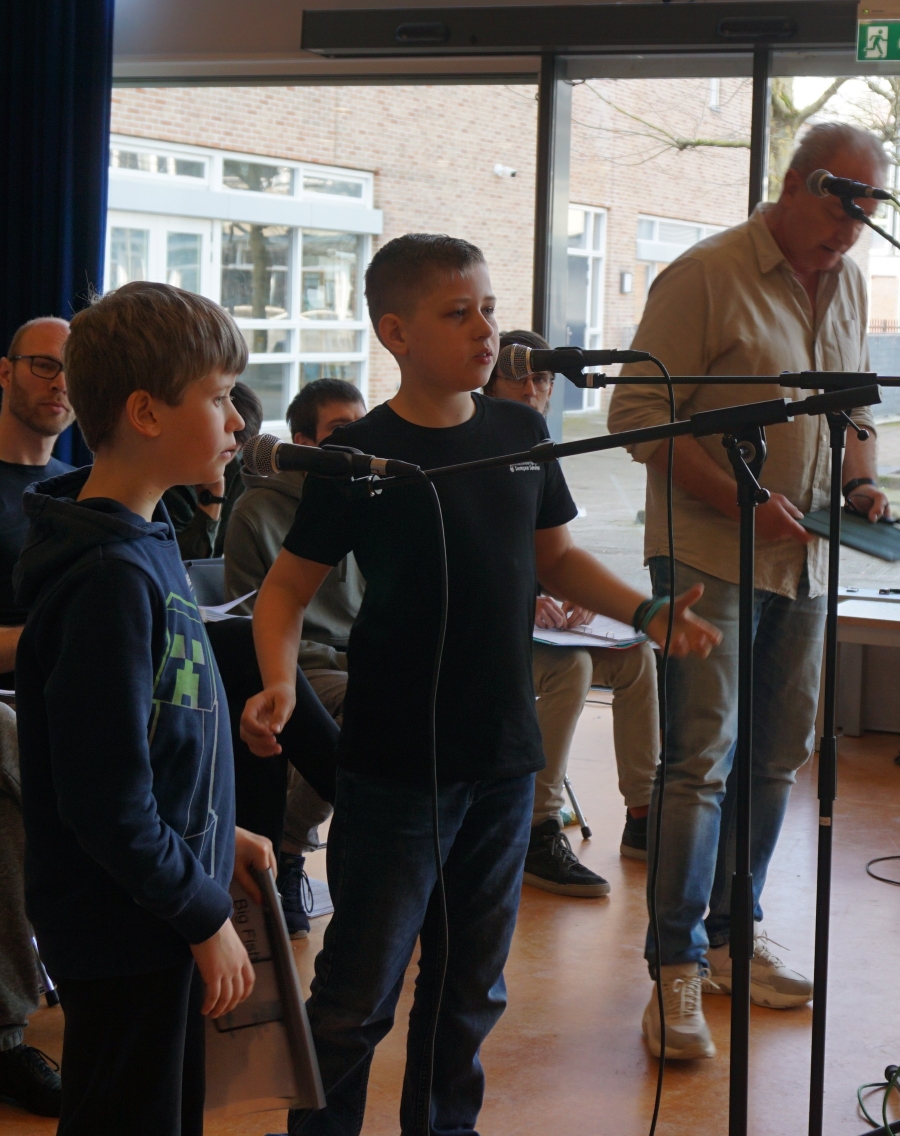 Niek: Ik denk inderdaad ook voor publiek spelen. Gelukkig gaan we eerst oefenen voor een lege zaal. Een zendertje op is niet helemaal nieuw voor mij, want ik heb er weleens een op gemogen bij het werk van mijn moeder. Toen heb ik er niet door mogen praten, dus ik vind het spannend hoe ik dan moet praten. Dat zal even wennen zijn.
