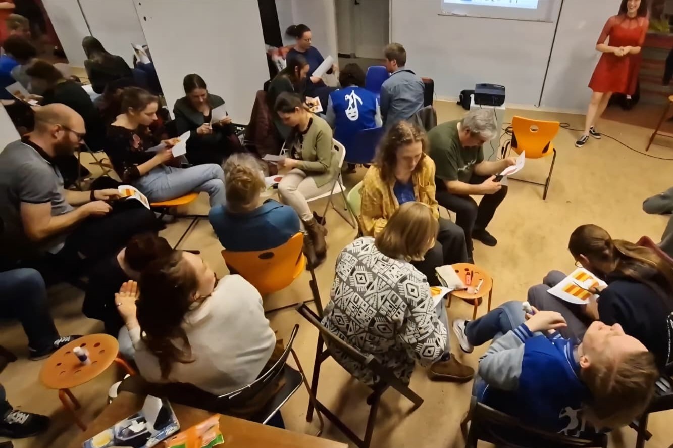 3 maart is de kaartverkoop van start gegaan en traditiegetrouw hebben we dit de maandag van tevoren gevierd met onze leden! Na de repetitie werd de Cultuurwerkplaats omgetoverd tot een heuse battle zone en werd er gestreden om het allereerste vrijkaartje voor ‘Big Fish’. Dit door middel van verschillende rondes waarin hun commissie skills werden getest. Ronde 1 stond in het teken van decor: de leden moesten zo snel en zo goed mogelijk een circustent in elkaar knutselen. Ronde 2 stond in het teken van de Kostuumcommissie waarin ze de knopen uit een bolletje wol moesten halen. In ronde 3 moesten ze net zoals in de PR commissie vaak gedaan wordt, de spellingsfouten uit een tekst halen. Ton van Dortmont kon ten slotte als beste inschatten hoeveel vissnoepjes er in de grote pot zaten en ging daarom met het eerste vrijkaartje naar huis.